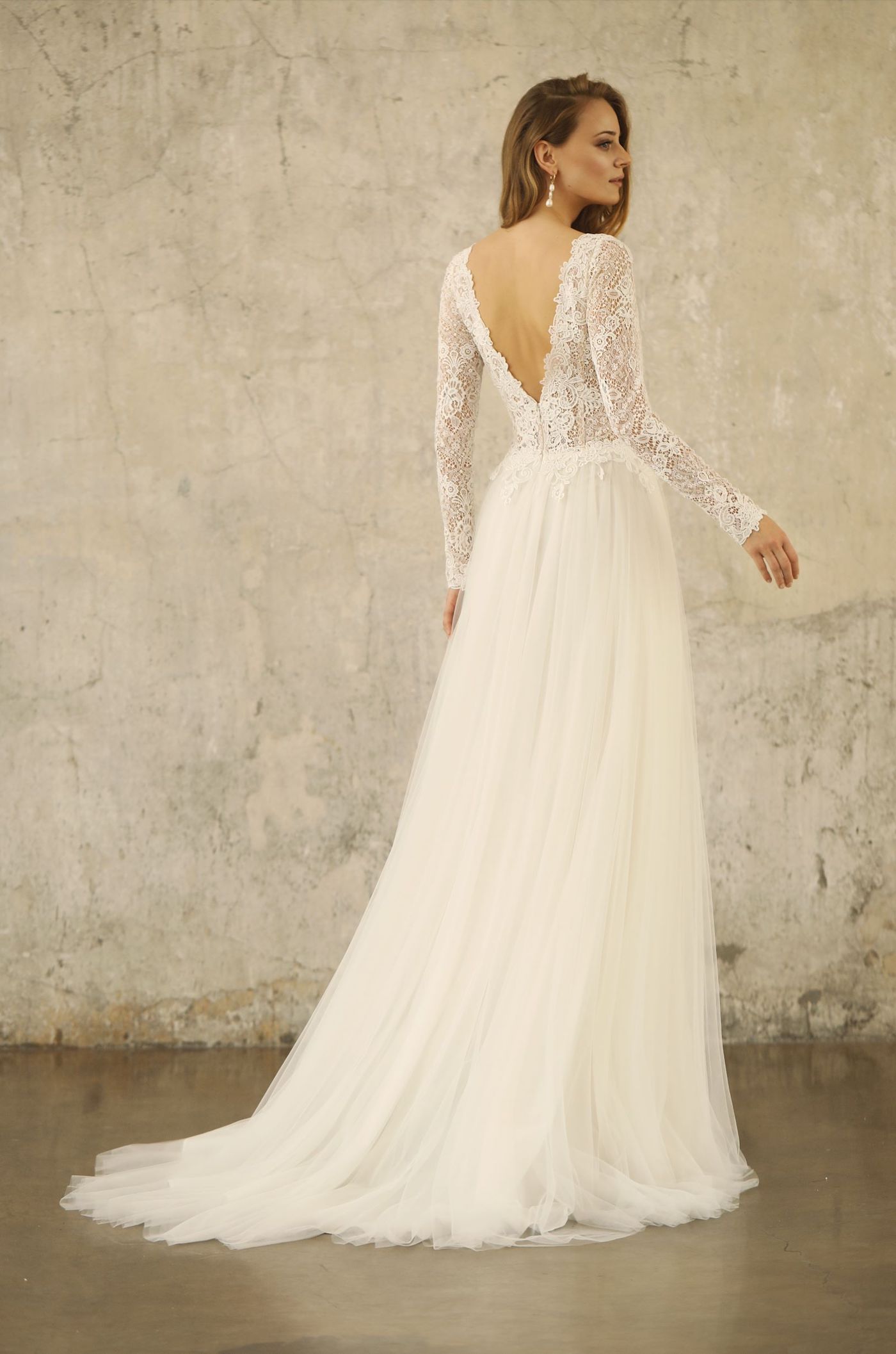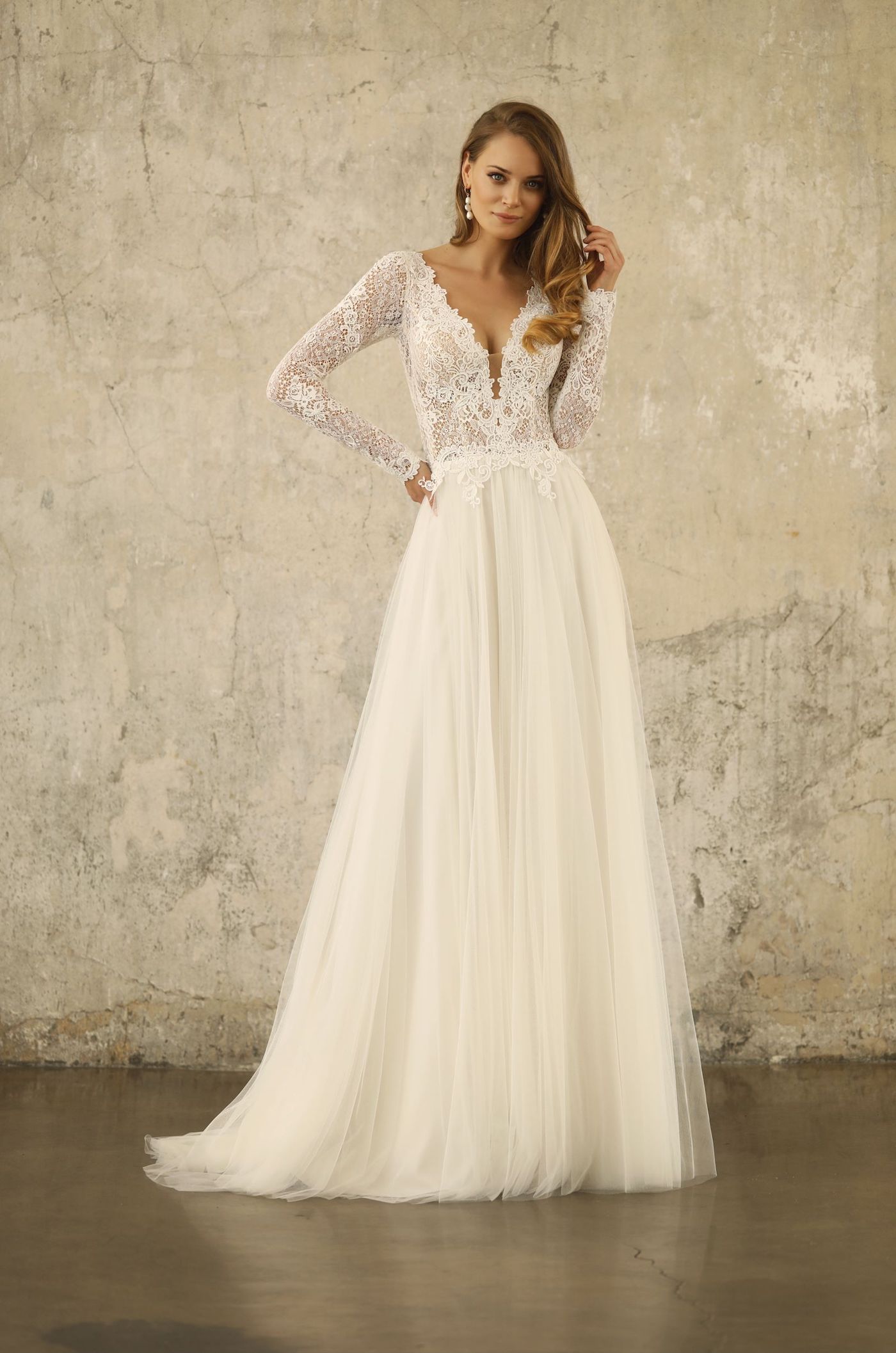 Neu im Atelier. Ein wunderschönes Brautkleid mit einem Rock aus Softtüll mit Schleppe und einer traumhaft weichen Spitze im Oberteil. Lange Arme und V-Ausschnitt.