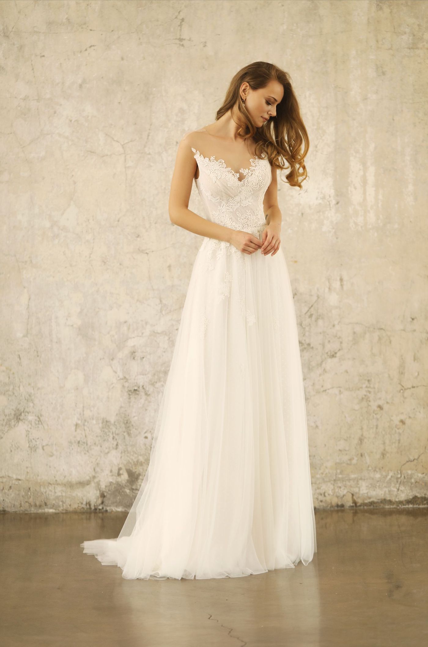 Neu im Atelier. Ein wunderschönes Brautkleid mit einem Rock aus softigen Pünktchentüll mit Schleppe und einer traumhaft weichen Spitze im Oberteil. Ohne Arme. Corsage