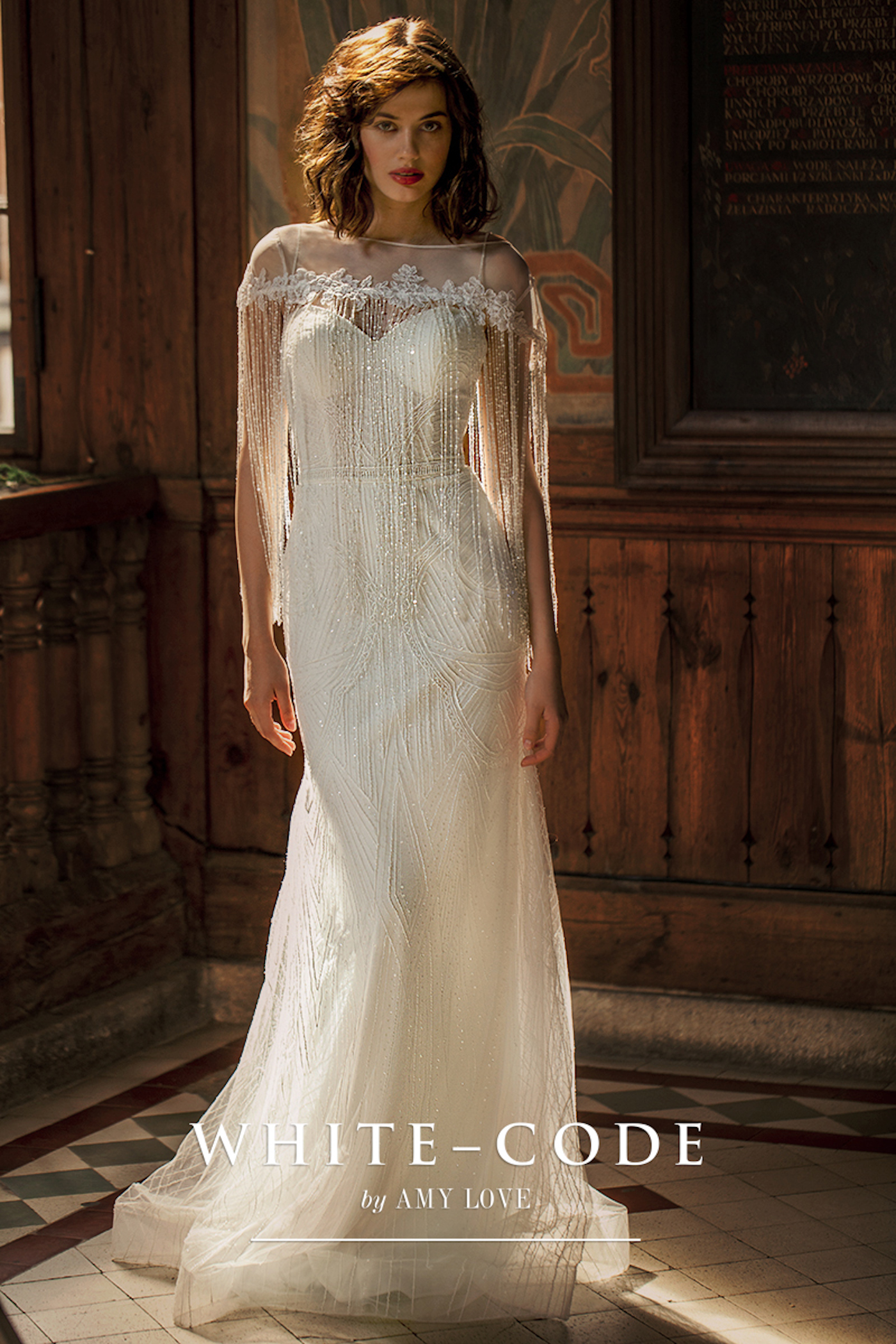 Ein sehr extravagantes Korsagenkleid mit einer geometrisch verlaufenden Spitze im Art Deco Style. Der Rock schmiegt sich raffiniert an die Hüften. Um die Taille verläuft ein zarter Gürtel. Das Cape ist abnehmbar.