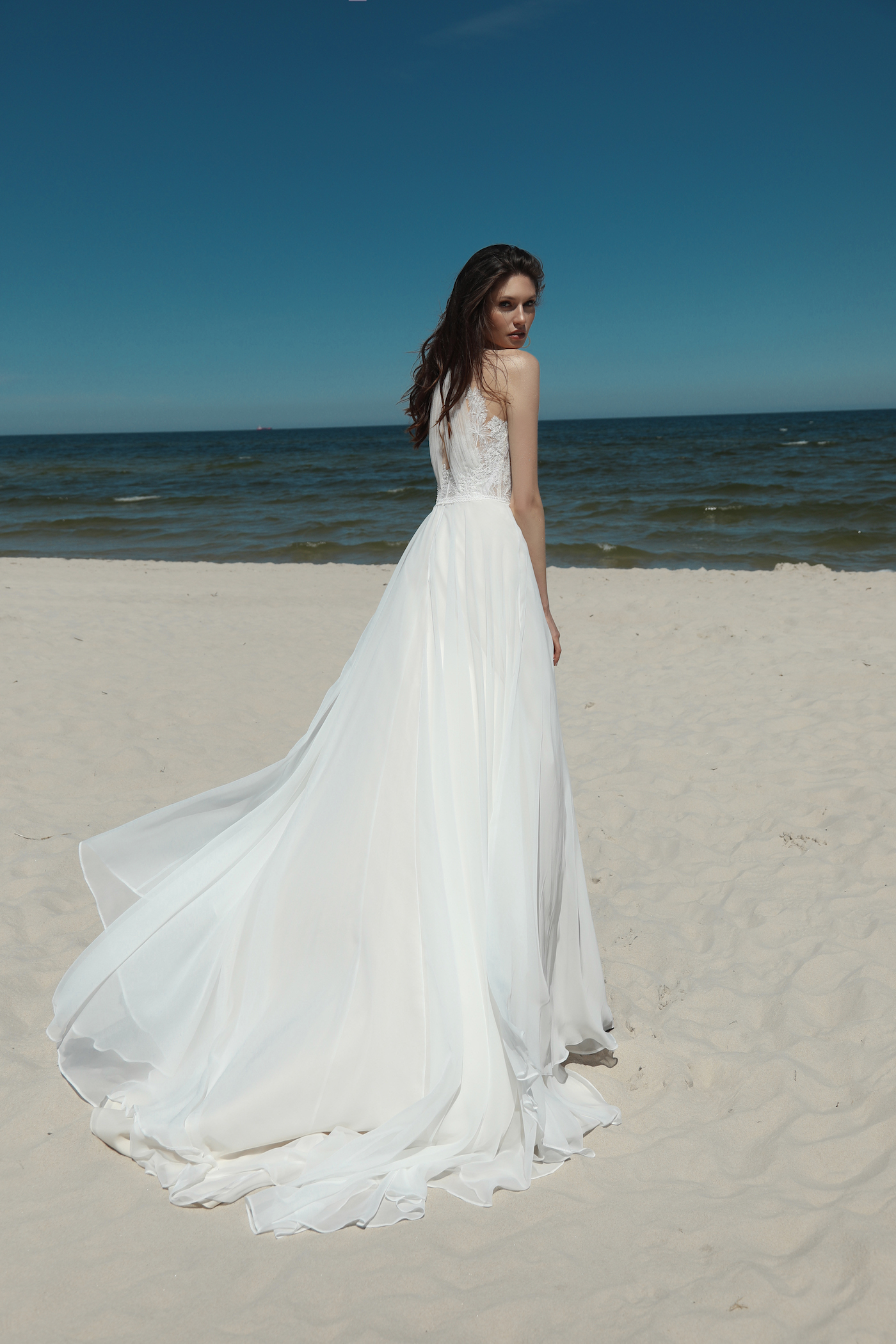 Emily ist ein echter Bestseller. Das Neckholderoberteil wurde aus Softtüll drapiert und ist mit Spitze verziert. Im Rücken lässt ein Schlüssellochschlitz tief blicken. Der Rock mit langer Schleppe ist aus seidigem Chiffon. Ein Favorit für eine Hochzeit am Strand aber natürlich auch woanders.