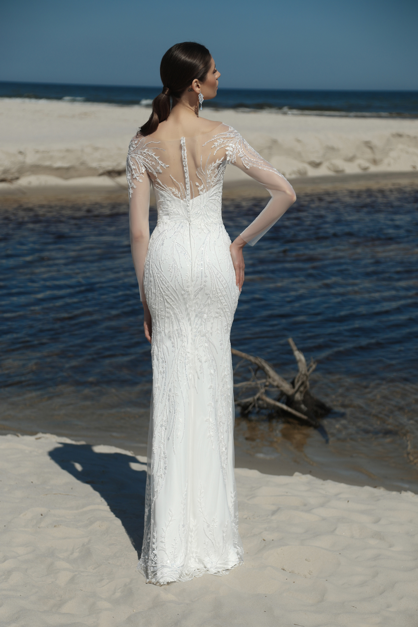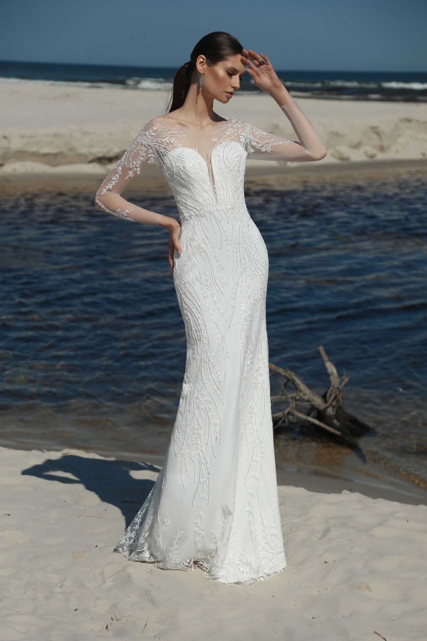 Ein wunderschönes fit & flare Brautkleid. Die Herzkorsage hat einen tiefen Ausschnitt und das Kleid schmiegt sich betont an den Körper. Es ist liebevoll und aufwendig mit Spitze verziert. Im Rückenteil gibt es eine Knopfleiste und die Schleppe aus Glitzertüll und Spitze ist abnehmbar.