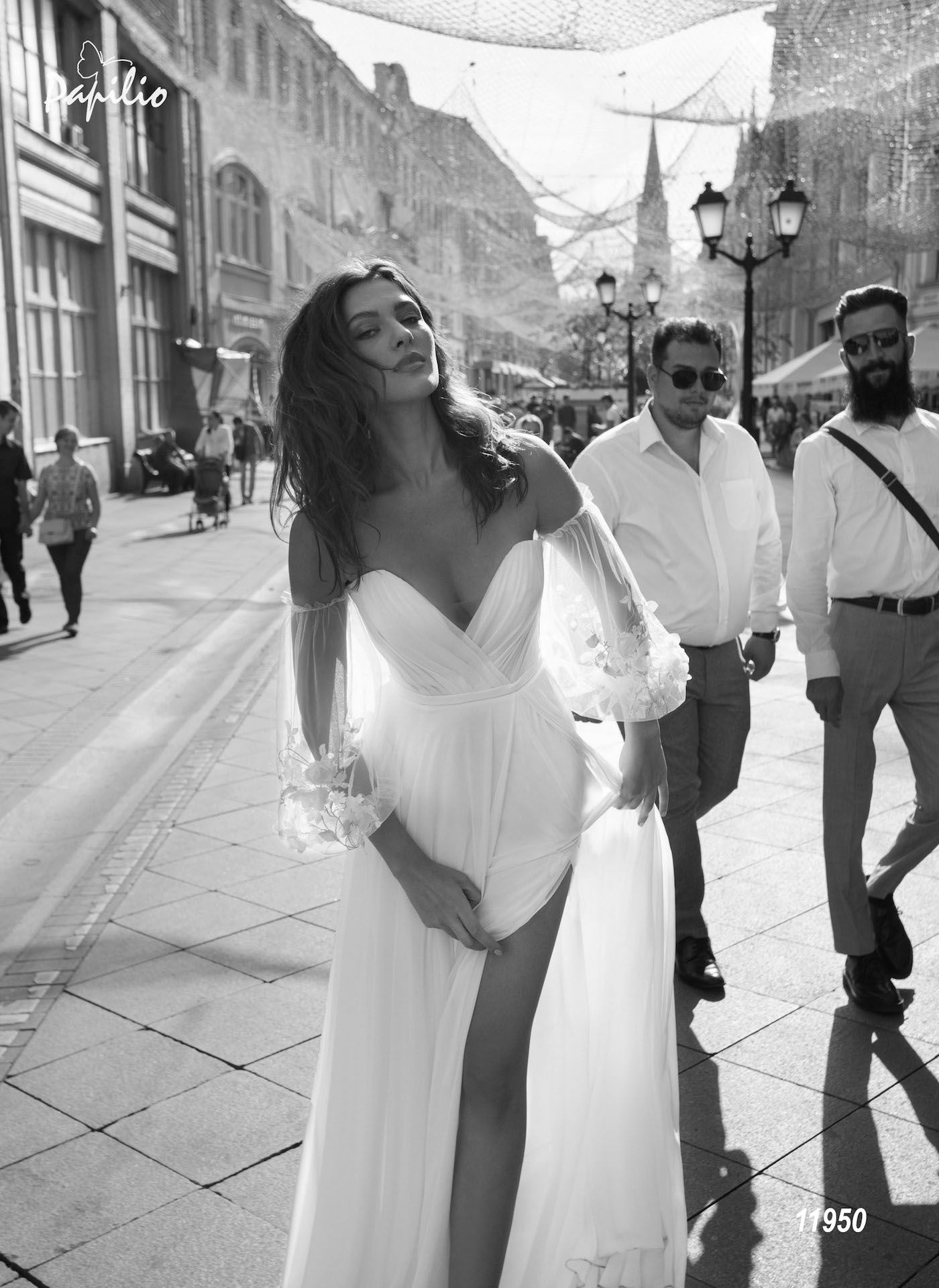 Ein zauberhaftes Corsagenkleid mit Puffärmelm aus Tüll und von Hand aufgenähten 3D Blumen. Schulterfrei. Sehr extravagantes Design für die Experimentalistin. Der Rock hat einen Beinschlitz und eine lange Schleppe und die Corsage ist teils mit rosé Tüll drapiert. Gürtel in Rosé mit Schleife.