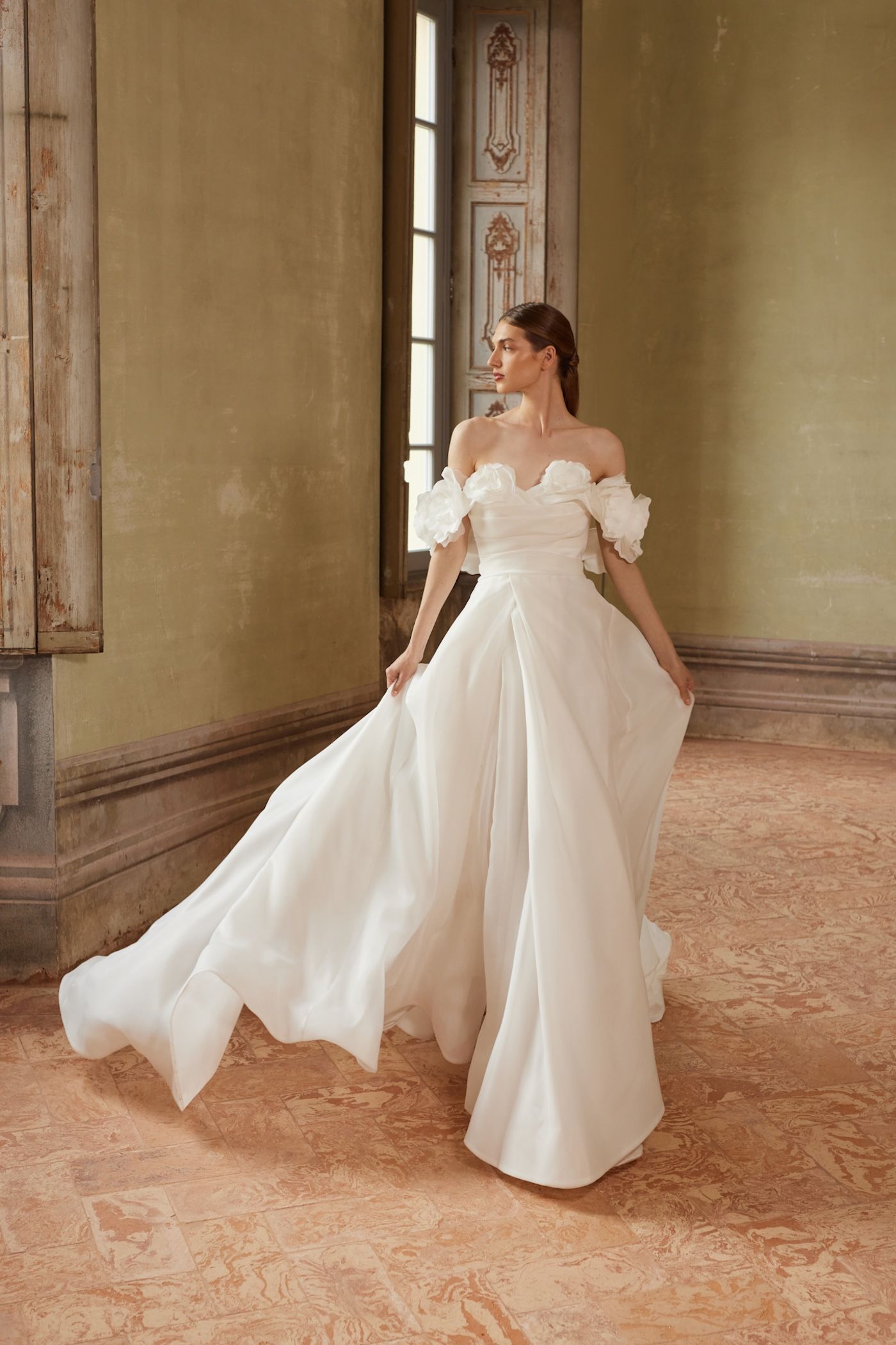 Als Helmar in den Store einzog waren wir alle verzaubert. Dieses Prinzessinnenkleid besteht aus einer drapierten Korsage, einem Rock mit einer langen Schleppe und einem Beinschlitz. Es wird im Rücken mit einem Reißverschluß geschlossen und hat zusätzlich einen BH-Verschluß für den Halt der Korsage eingearbeitet. Oben an der Korsage verzieren Rosen aus Organza den Abschluß und diese Rosen verlaufen verspielt um die Arme.
