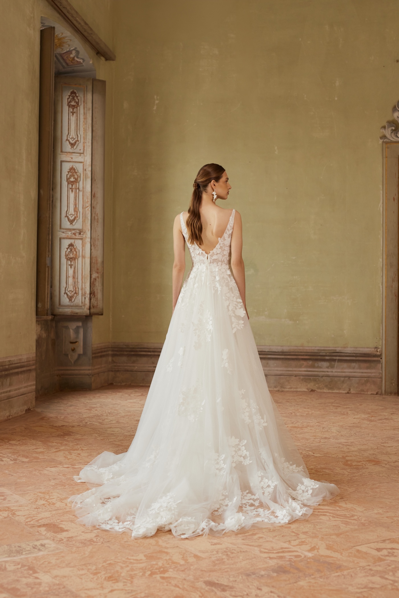 Ein Kleid für die Prinzessin. Moderne florale Spitze (glitzert leicht) die in den Tüllrock fließt verziert dieses Kleid. Ein V-Ausschnitt dominiert im Vorderteil und im Rücken. Die Träger sind angenehm breit. Das Kleid wird mit einem Reißverschluß geschlossen. Es gibt Cut Outs an den Seiten und vorne im Ausschnitt. Der Rock besteht aus vielen Lagen Tüll, auch eine Lage Glitzertüll (diese muss nicht zwingend bestellt) werden. Es gibt eine sehr lange Schleppe die aufwendig mit viel Spitze verziert wurde.