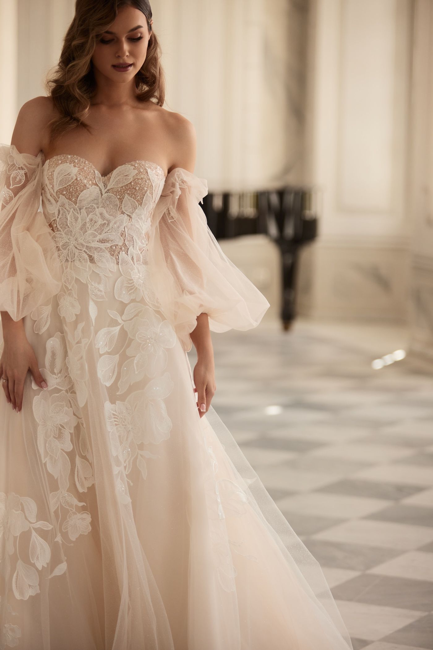Ein wunderschönes Korsagenkleid mit großer Blüten/Blätter Spitze und 3D Blüten. Teilweise mit Perlen bestickt und mit abnehmbaren Puff/Tüllärmeln die mit Gummizug gehalten werden. Das Kleid hat eine lange Schleppe, die noch mit Spitze bestickt ist.