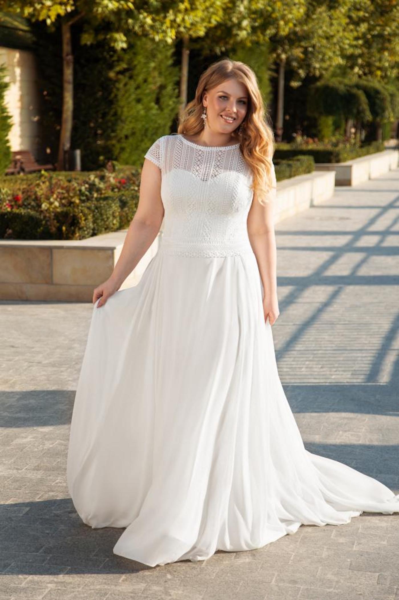 Ein wunderschönes Curvy-Brautkleid mit einem Oberteil aus geometrischer Makrameespitze und einen wunderschönen offen gestalteten Rücken. Es hat angeschnittene Spitzenärmel, der Chiffonrock eine Schleppe und die Taille wird durch einen Spitzenschoß betont.