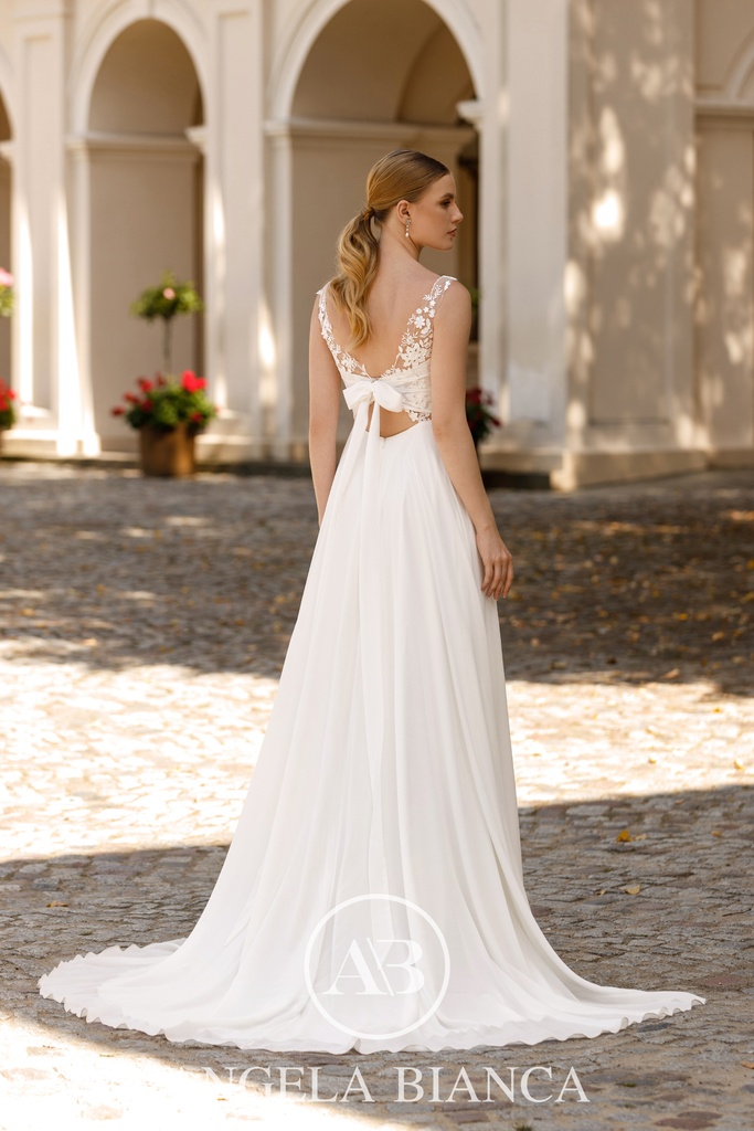 Nancy ist im Vorderteil sehr ruhig gehalten aber im Rückenteil ein absoluter Hingucker. Die Drapage im Vorderteil schmeichelt der Taille und der Spitzenrücken wird mit einer Schleife gehalten. Nancy hat eine Schleppe.