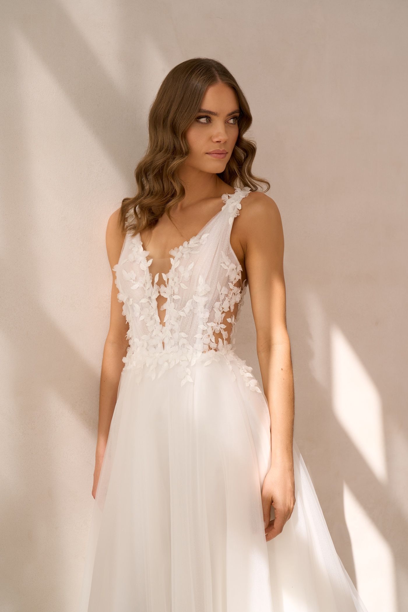 Sloan ist ein wunderschöner Hingucker mit einem tiefen V-Ausschnitt. Es hat breitere Träger und das Oberteil ist mit einer Tülldrapage und 3D-Spitze verziert. Der weite Rock mit Schleppe ist aus Tüll/Glitzertüll und die 3D-Blätterspitze verläuft spielerisch in den Rock. Ein weiteres Highlight sind die Cut-Outs an der Seitenlinie im Oberteil.