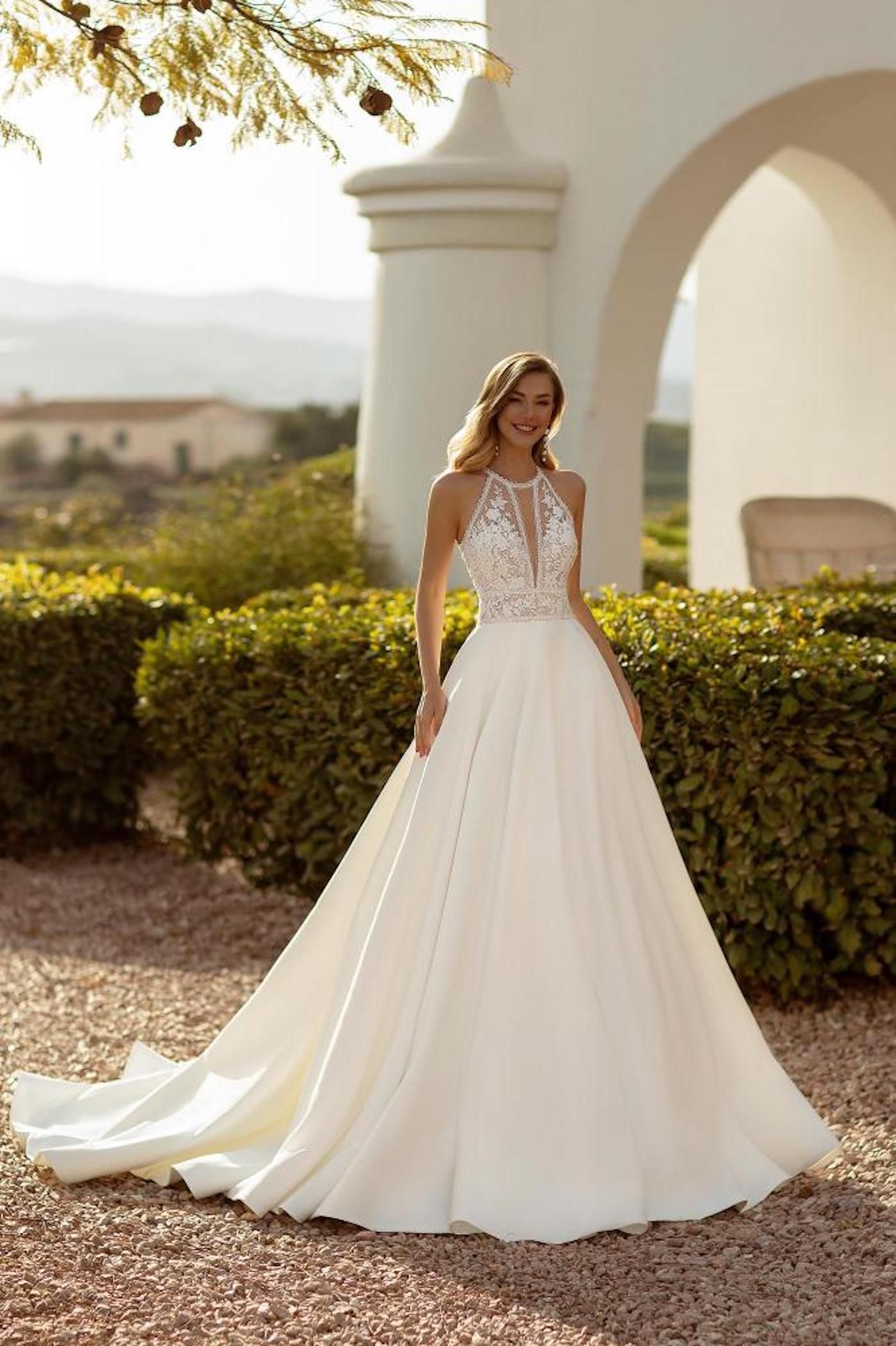Ein wunderschöner Zweiteiler mit einem Neckholder-Oberteil aus Spitze, nude unterlegt. Dazu empfehlen wir einen langen Tüllrock mit Schleppe der ebenfalls nude unterlegt ist. Aber auch Chiffonröcke oder Hosen.