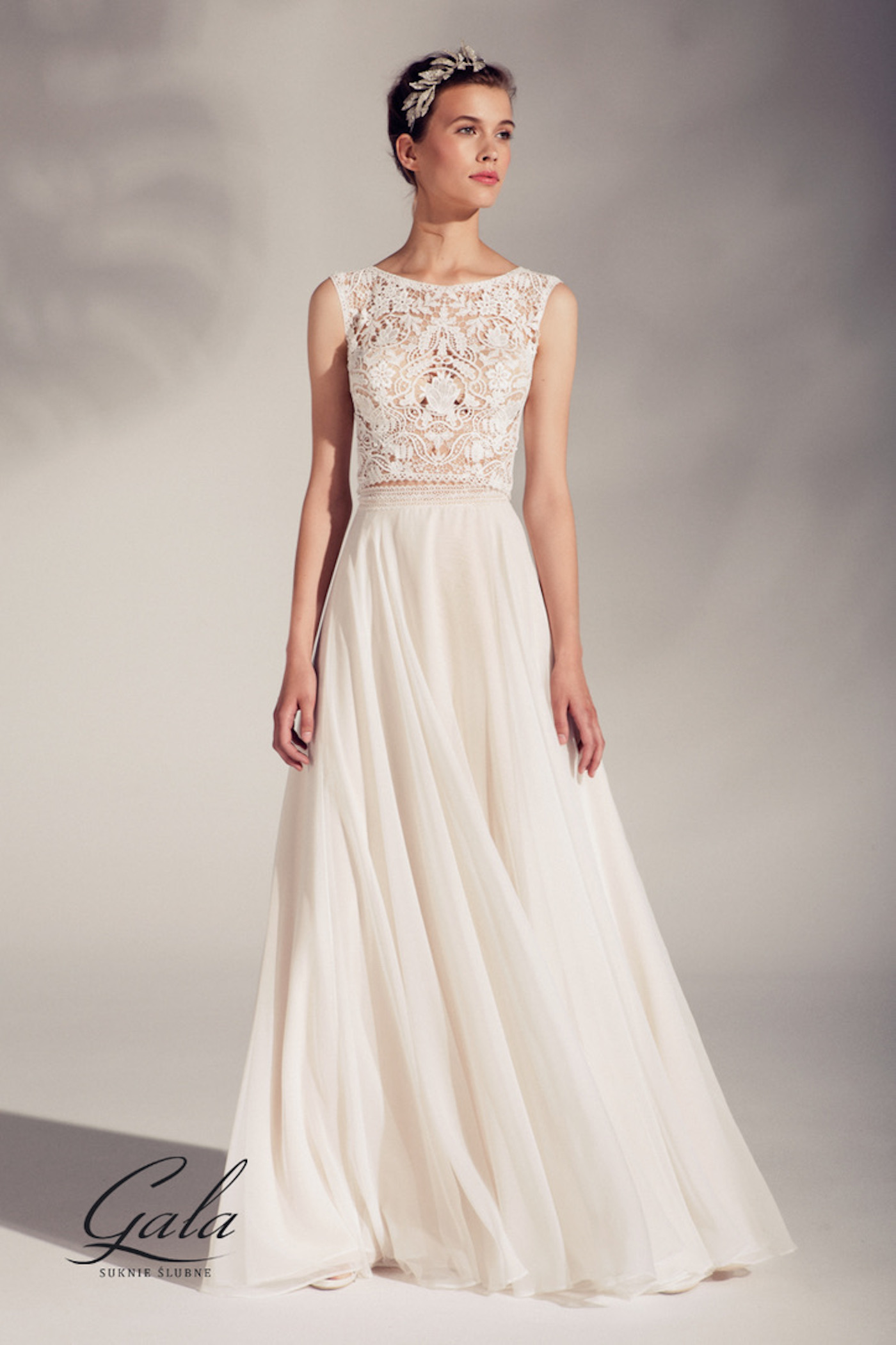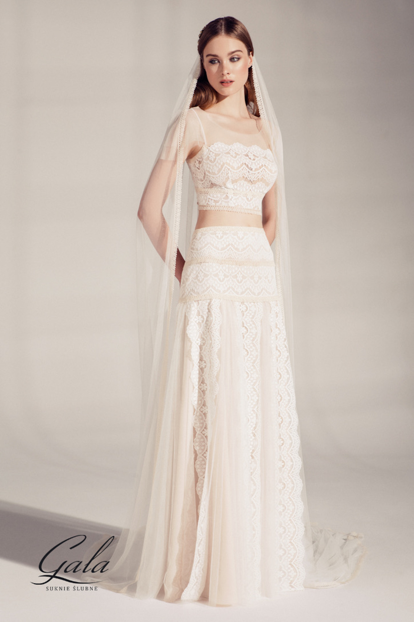 Ein wunderschöner Zweiteiler mit einem Oberteil aus Spitze, nude unterlegt und angeschnittenen Ärme…
