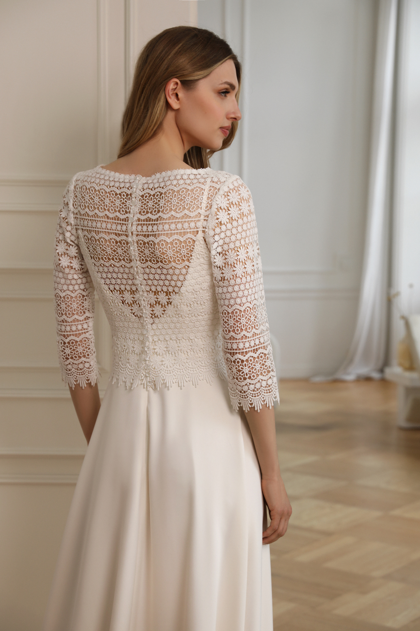 Bolero aus geometrischer Spitze. Passt perfekt zum Bohostyle. Mit Ärmeln und Knopfleiste im Rückenteil.