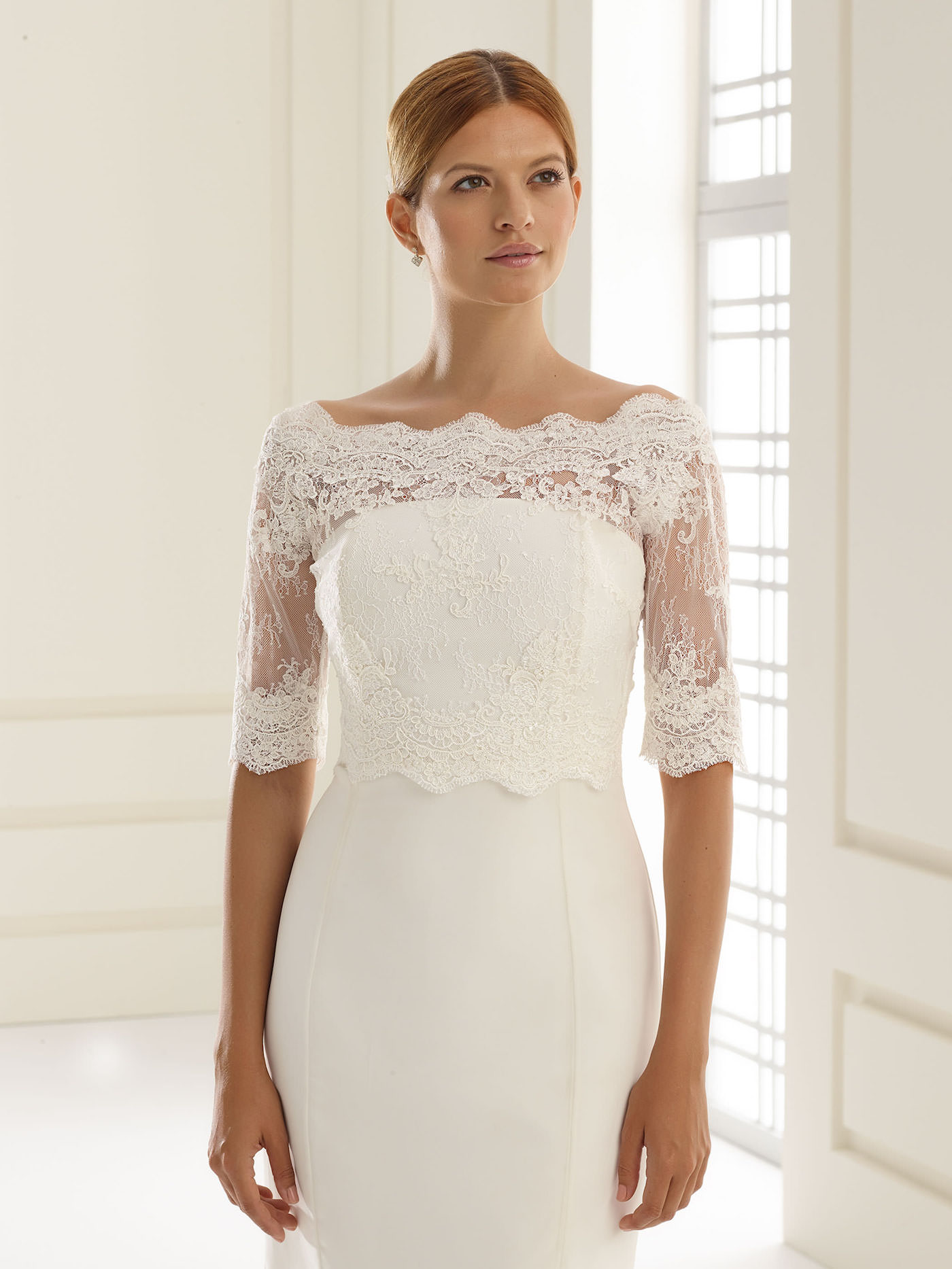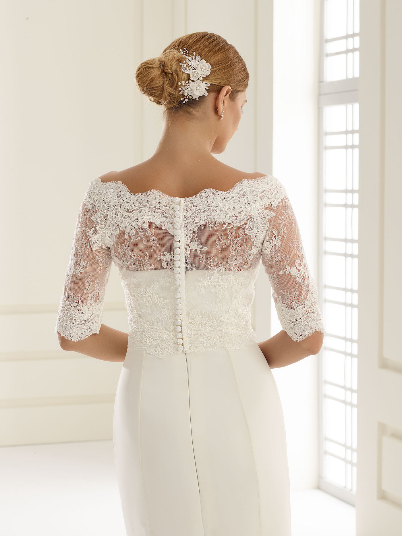 Dieser Bolero wertet die meisten unserer Basic-Brautkleider auf. Aus einem schlichten Basic-Brautkleid wird ein wunderschönes Spitzenbrautkleid gezaubert.