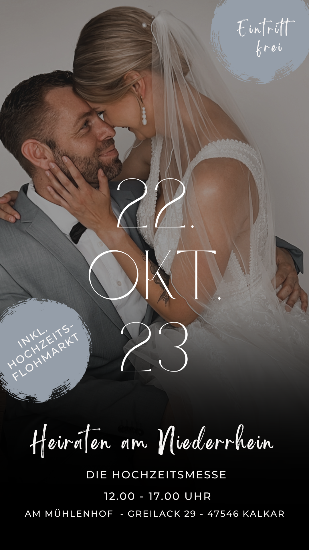 Save the Date - am 22.10.23 ist es wieder soweit. Unsere Hochzeitsmesse Heiraten am Niederrhein geht in die nächste Runde. Und dieses mal erwartet unsere Besucher neben Livemusik, über 40 Ausstellern, Foods & Drinks & Goodiebags auch ein tolles und brandneues Rahmenprogramm und ein Hochzeitsflohmarkt. WOW!!!Von 12.00-17.00 Uhr könnt ihr euch informieren, inspirieren, stöbern und beraten lassen. Wir und das gesamte Austellerteam freuen uns auf euren Besuch.Der Eintritt ist frei.P.S. UND NATÜRLICH GIBT ES WIEDER EINE MODENSCHAU VON UNS 💕.