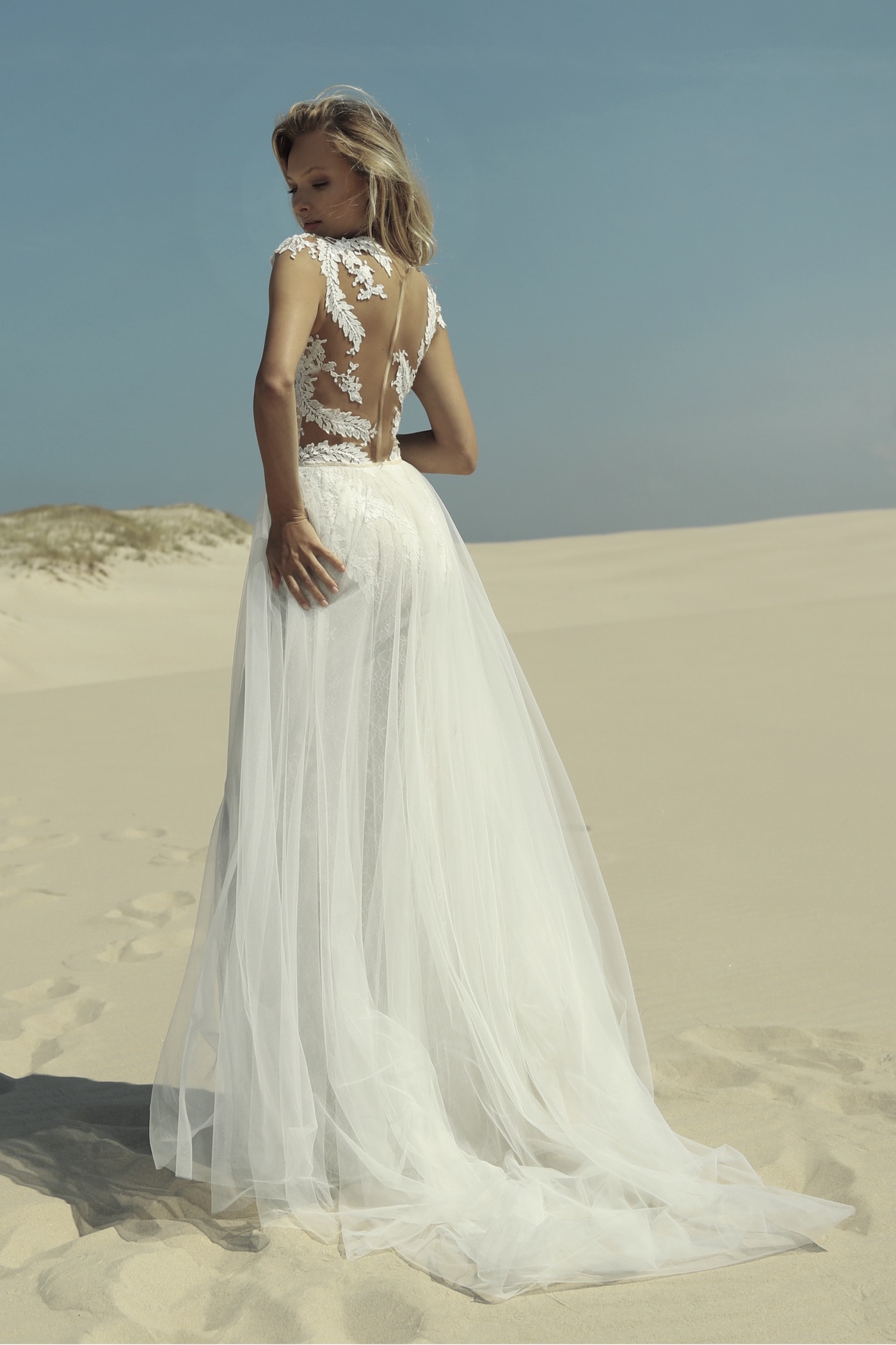 Kleid mit engem Unterrock aus französicher Spitze und darüber ein weiter Tüllrock mit Schleppe. Das transparente Oberteil ist aufwendig mit Spitze verziert. Perfekt für eine Hochzeit am Strand.