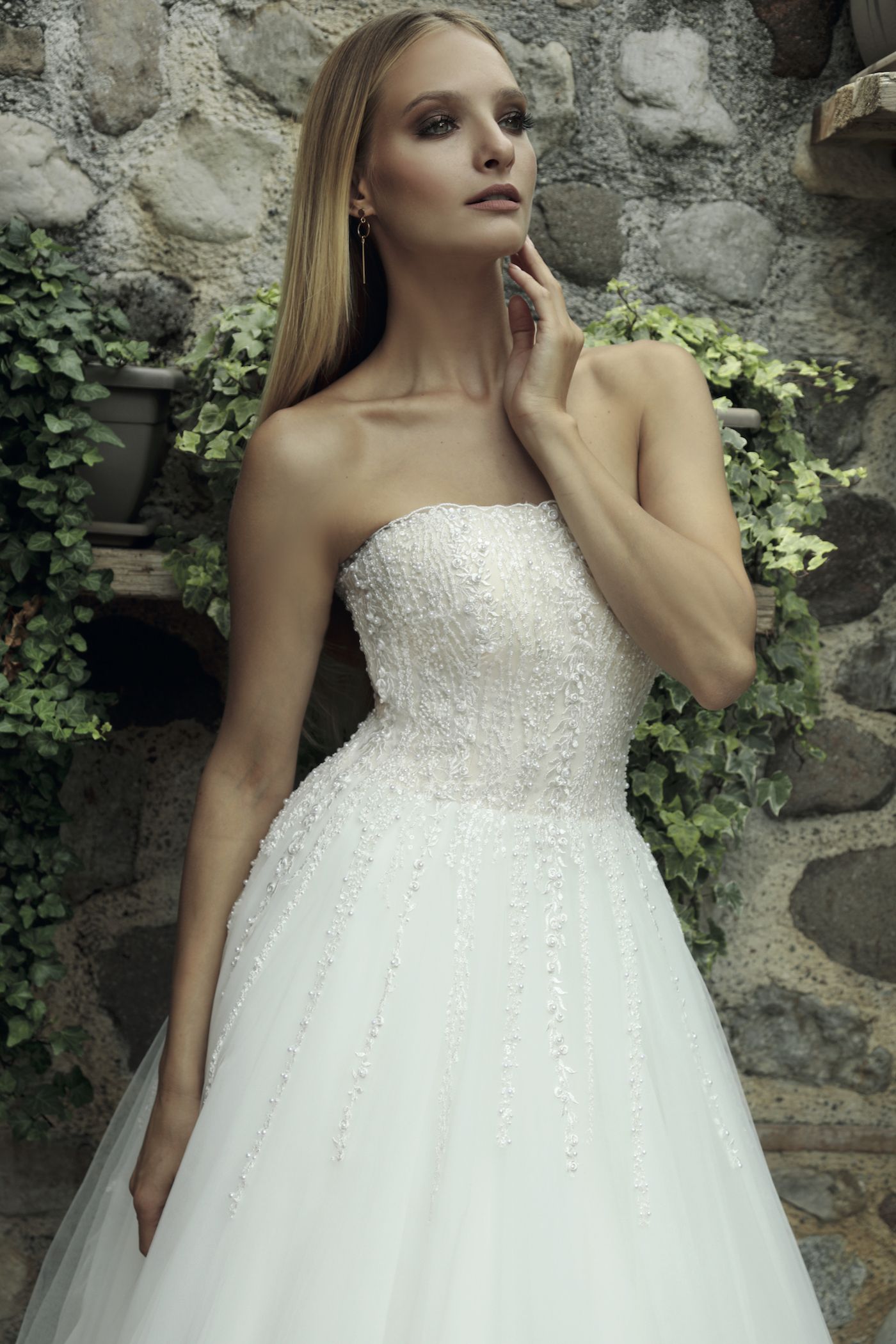 Klassisches Brautkleid. Das Corsagen-Oberteil mit geradem-Ausschnitt wird mit vielen Kristall- und Perlenketten bestickt. Der weite Rock mit einer Schleppe besteht aus mehreren Lagen Tüll. Die Kristall- und Perlenketten laufen in den Rock über.