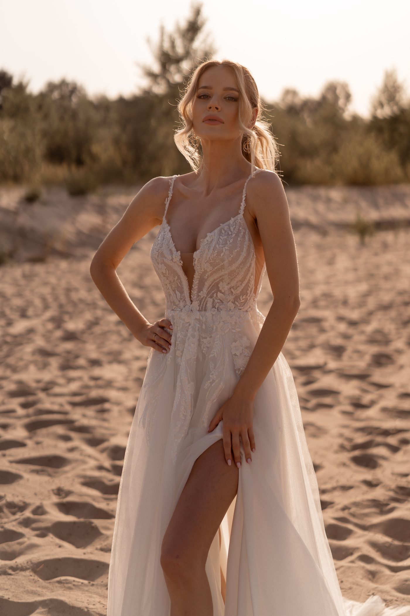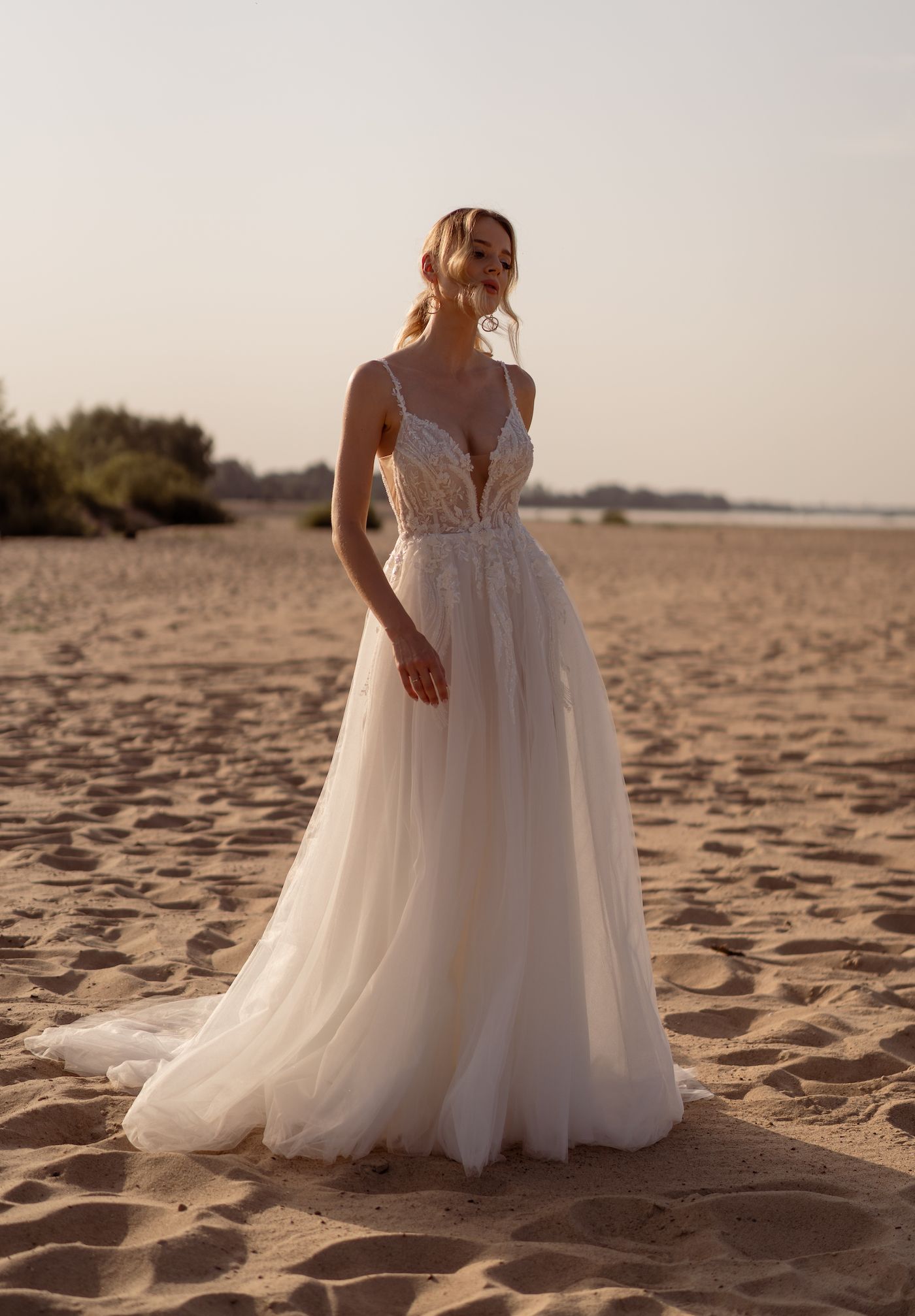 Bridget ist für die romantische Braut. Das Vorder- und Rückteil hat einen V-Ausschnitt und Spaghettiträger. Es ist liebevoll mit Spitze, Pailletten und Kristallen verziert und die Spitze läuft in den Tüllrock mit Glitzertüll. Dieses Brautkleid funkelt einfach wunderschön. Das Vorderteil hat an der Seitenlinie Cutouts aus Tüll. Der Rock aus Glitzertüll hat einen Beinschlitz und eine lange Schleppe.
