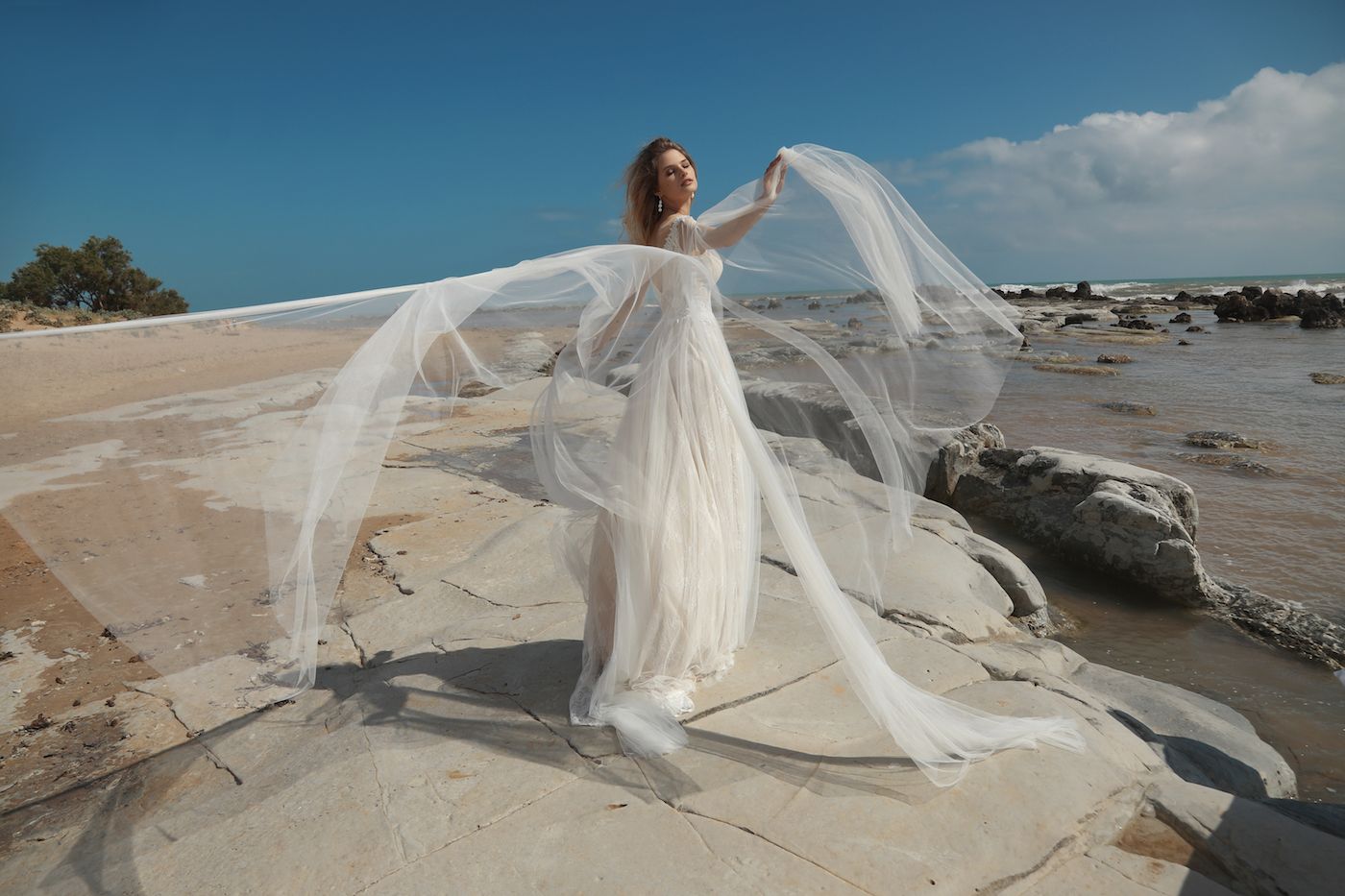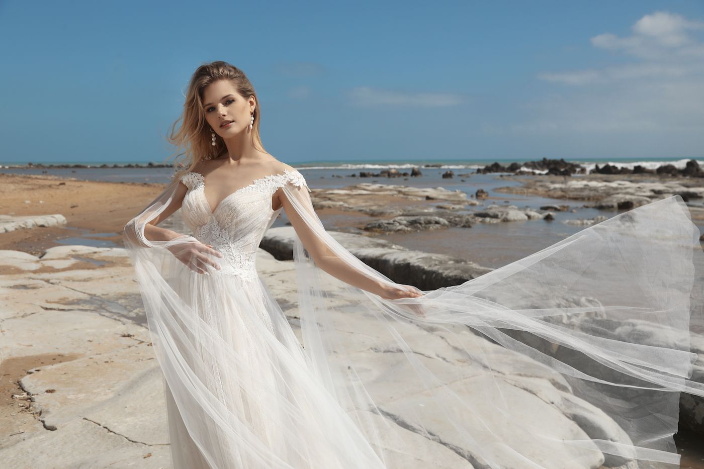 Der große Vorteil dieses Kleides sind wunderschöne abnehmbare Ärmel, die für den Effekt eines Umhangs mit Schleppe sorgen. Das aus anschmiegsamem Tüll, französischer Spitze und perlenbestickter Gipüre gemachte Kleid entzückt mit seiner Feinheit. Der spanische Ausschnitt verleiht diskreten Charme.