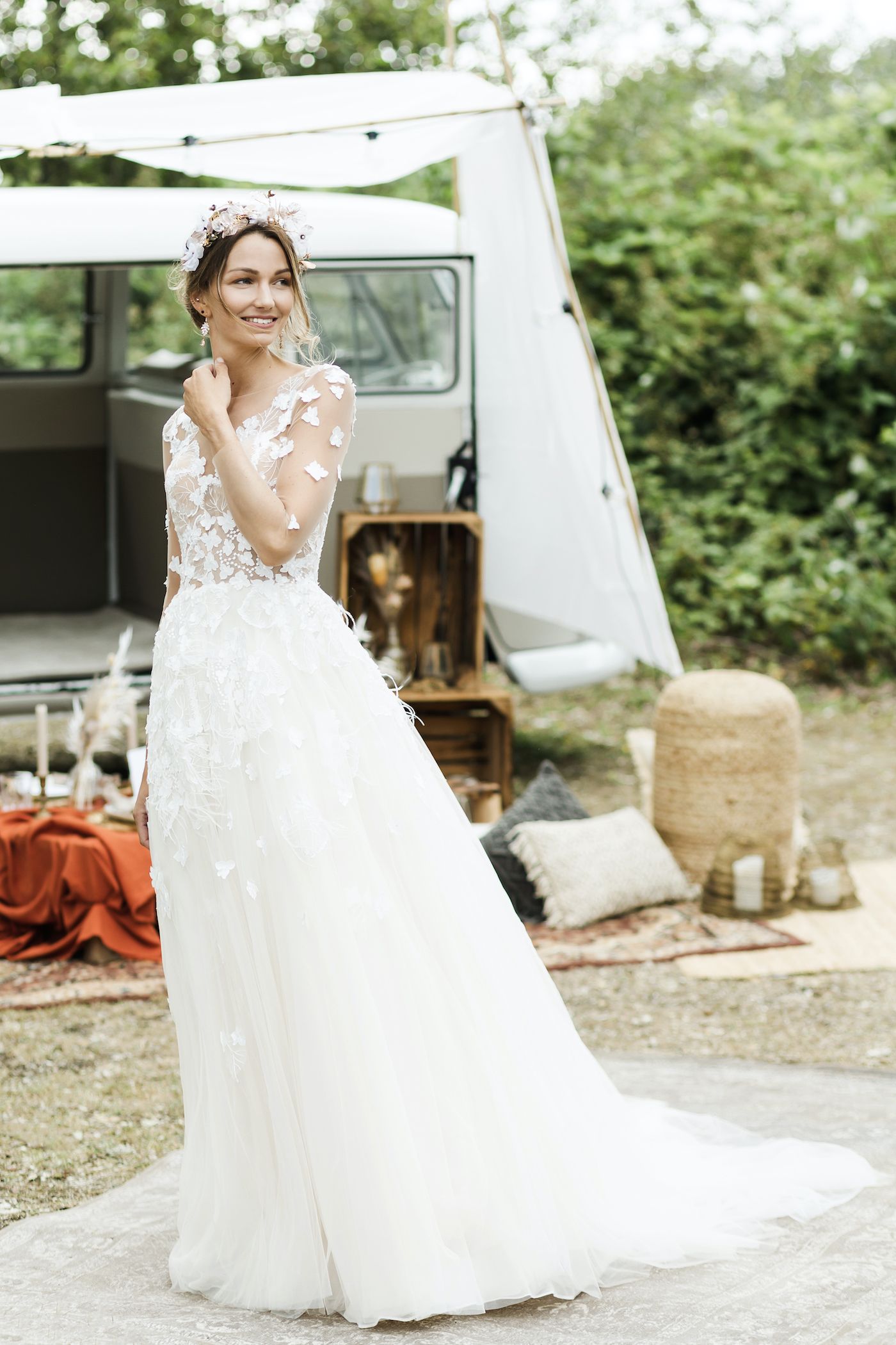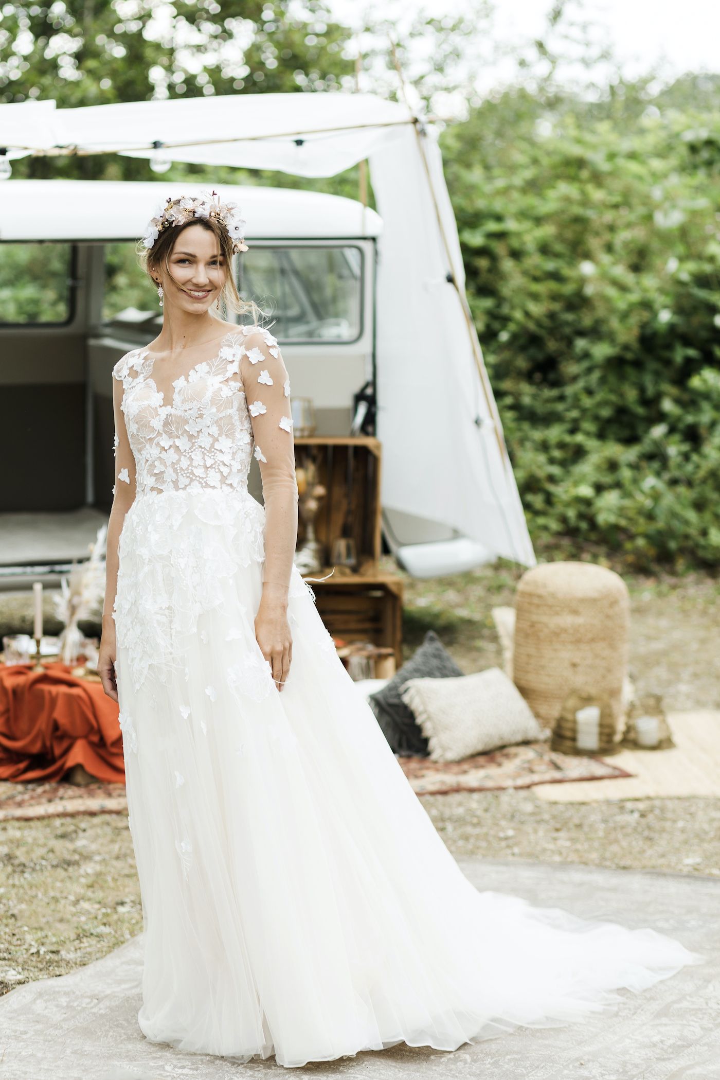 Dieses Kleid verzaubert. Die mit Laserstrahl ausgestanzten Satin-Blüten, die das Kleid schmücken, wurden mit Marabutfedern verbunden. Der lange Ärmel verleiht Eleganz. Der Tüll-Rock mit Schleppe wird von Hand mit Spitze und Federn geschmückt.