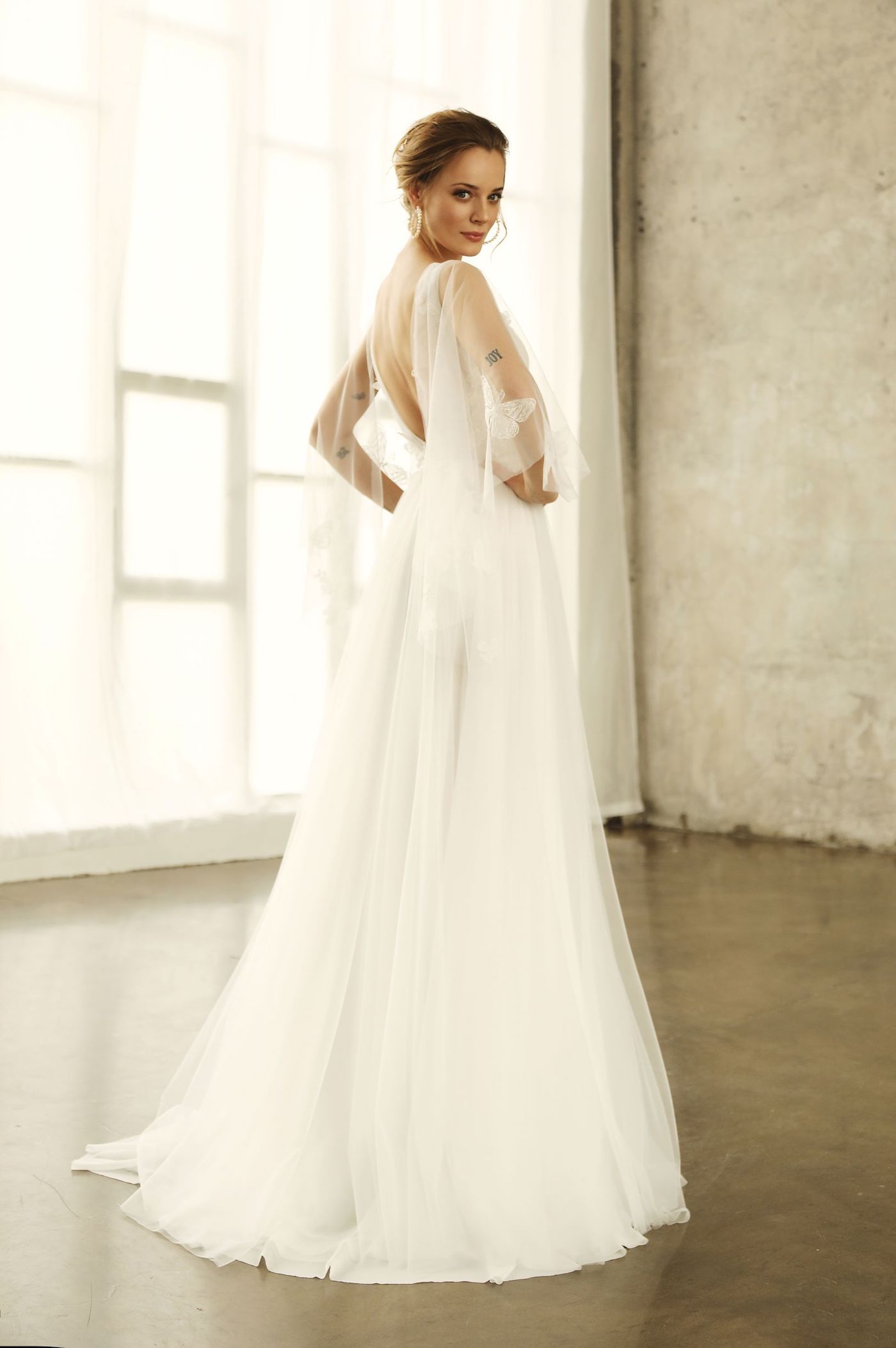Neu im Atelier: Ein märchenhaftes Brautkleid aus zartem Softüll, Spitze und Schmetterlingsmotiven im Oberteil und an den Fledermausärmeln.