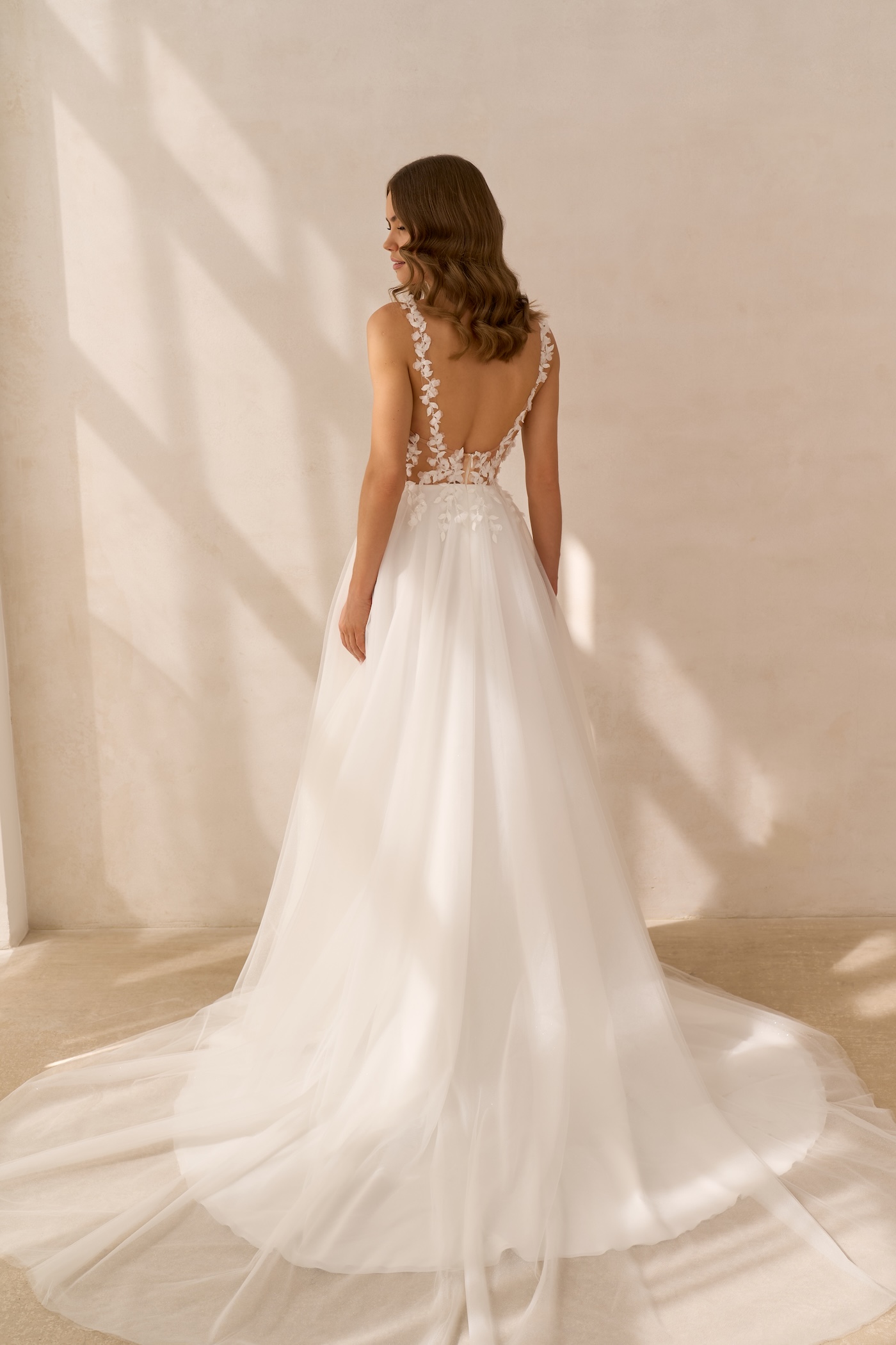 Sloan ist ein wunderschöner Hingucker mit einem tiefen V-Ausschnitt. Es hat breitere Träger und das Oberteil ist mit einer Tülldrapage und 3D-Spitze verziert. Der weite Rock mit Schleppe ist aus Tüll/Glitzertüll und die 3D-Blätterspitze verläuft spielerisch in den Rock. Ein weiteres Highlight sind die Cut-Outs an der Seitenlinie im Oberteil.